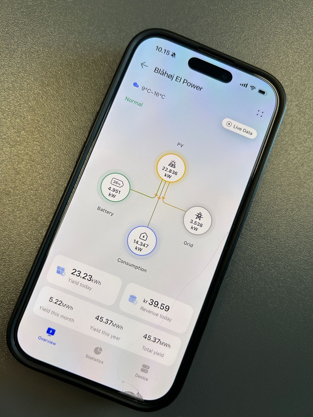 Som udgangspunkt er solceller en rigtig god idé hvis man ønsker at være selvforsynende med el. Hos Blåhøj El har vi selv solceller på bygningerne kombineret med batterier, så vi kan lagre den strøm vi ikke bruger. Det betyder at vi 90% af tiden er selvforsynende med strøm. Om natten bruger vi strømmen fra batterierne. Alt dette kan vi monitorere via en app, hvor vi kan se det hele i realtid og har data tilgængelig.